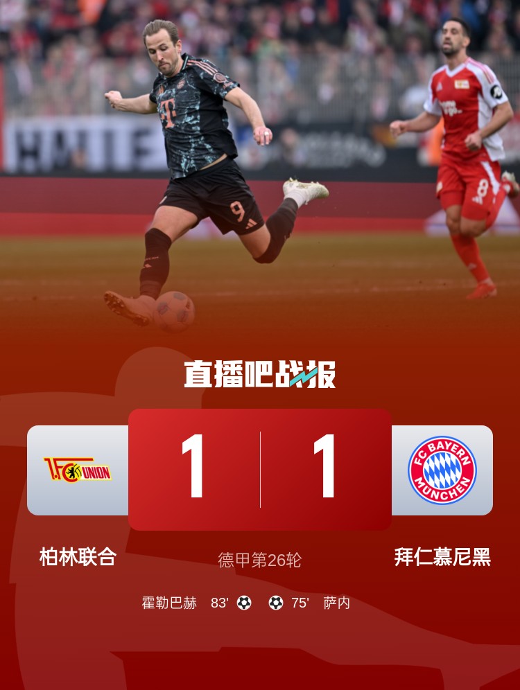 德甲第26輪,拜仁客場(chǎng)1-1柏林聯(lián)合,薩內(nèi)替補(bǔ)建功,烏爾比希失誤。