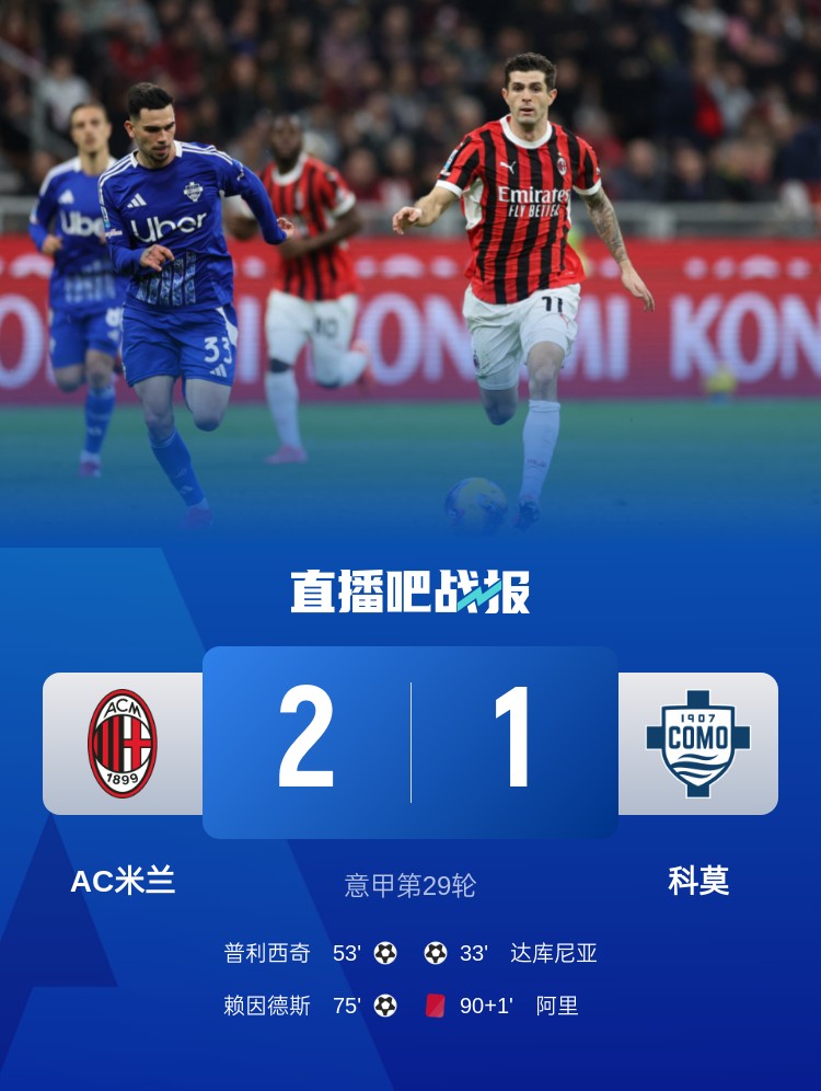 意甲第29輪AC米蘭2-1逆轉(zhuǎn)科莫,賴因德斯傳射,阿里首秀紅牌。