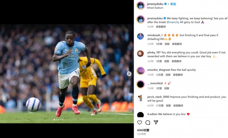不過他依然展現(xiàn)出良好心理素質(zhì),在賽后曬出自己的比賽照并鼓勵(lì)道:“我們繼續(xù)戰(zhàn)斗,我們依然堅(jiān)信!和大家在國家隊(duì)比賽周之后再見!@曼城俱樂部。榮耀歸于上帝。”