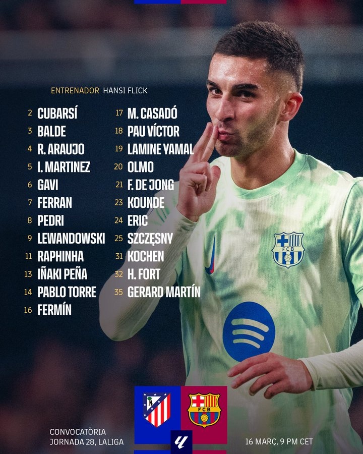 焦點(diǎn)大戰(zhàn)!巴薩客戰(zhàn)馬競(jìng)名單公布:亞馬爾、萊萬(wàn)、佩德里領(lǐng)銜