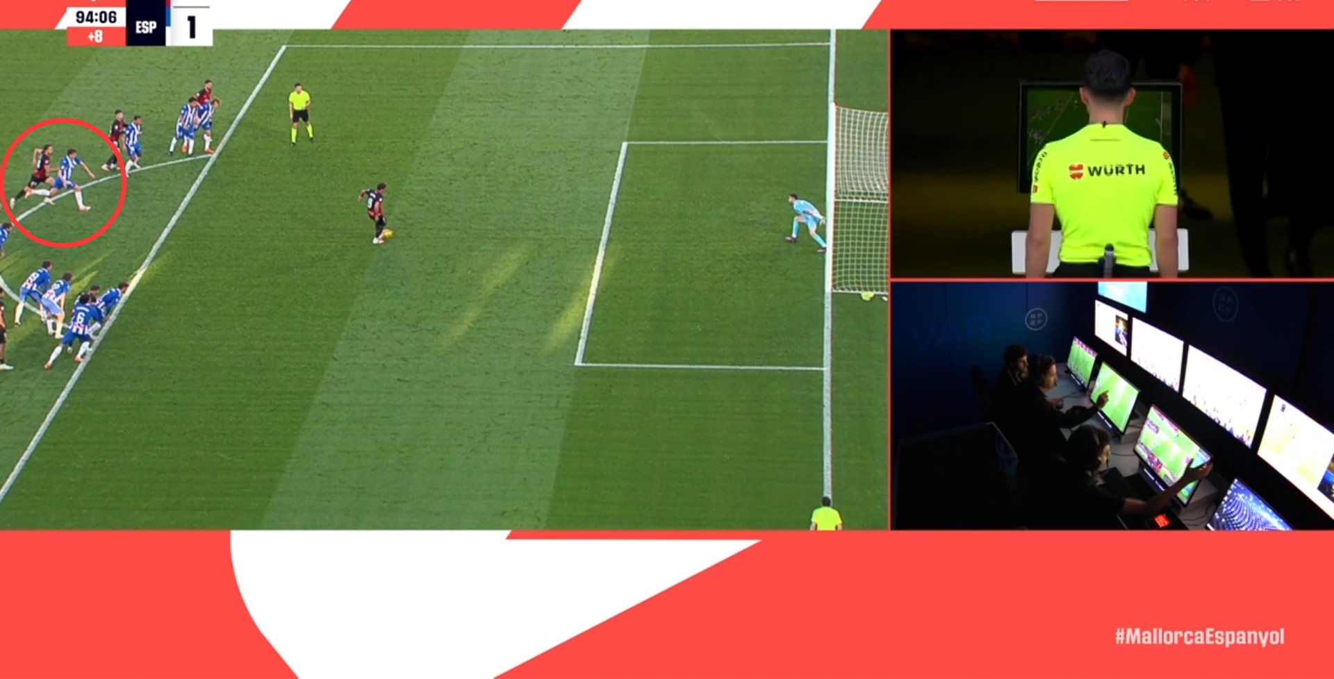 第92分鐘,VAR介入,主裁親自查看回放,此前西班牙人球員和馬略卡球員同時提前進入禁區(qū)?。ň嚯x點球點不滿9.15米),并對比賽產(chǎn)生影響,主裁判罰點球重罰