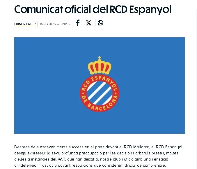對陣馬洛卡的比賽后,西班牙人足球俱樂部對多項裁判判罰表達深切憂慮,尤其是在VAR干預(yù)下做出的決定,這些難以理解的判罰讓俱樂部和球迷感到無助與沮喪。