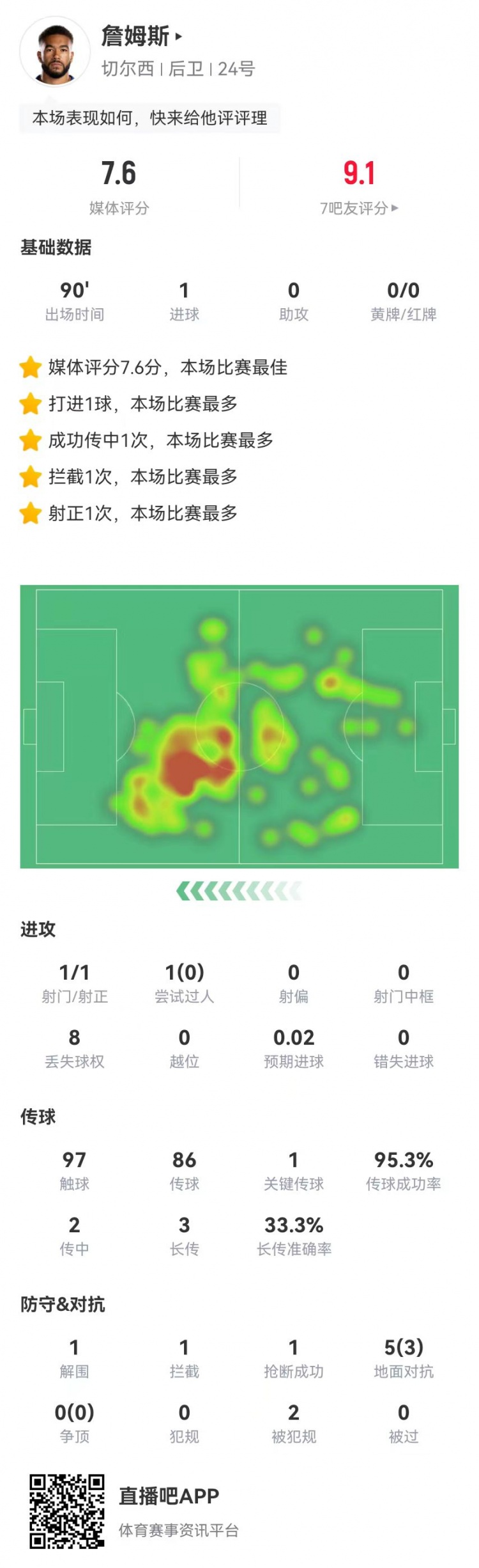 里斯-詹姆斯客串后腰數(shù)據(jù):1球+1關(guān)鍵傳球 5對(duì)抗3成功 7.6分最高