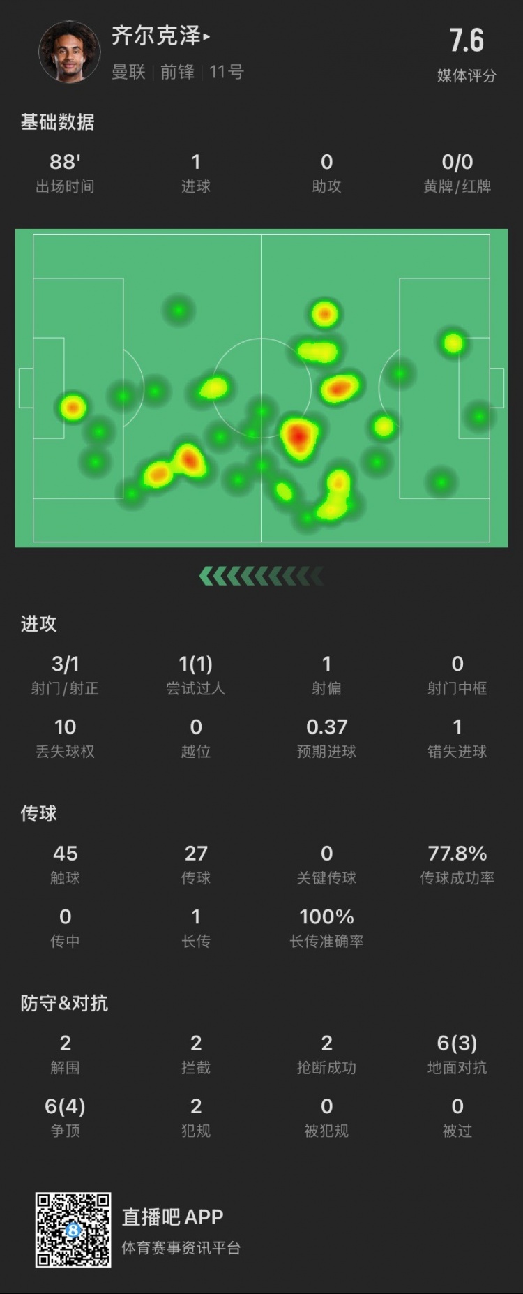 齊爾克澤本場(chǎng):3射1正進(jìn)1球,貢獻(xiàn)2解圍2搶斷,12次對(duì)抗成功7次