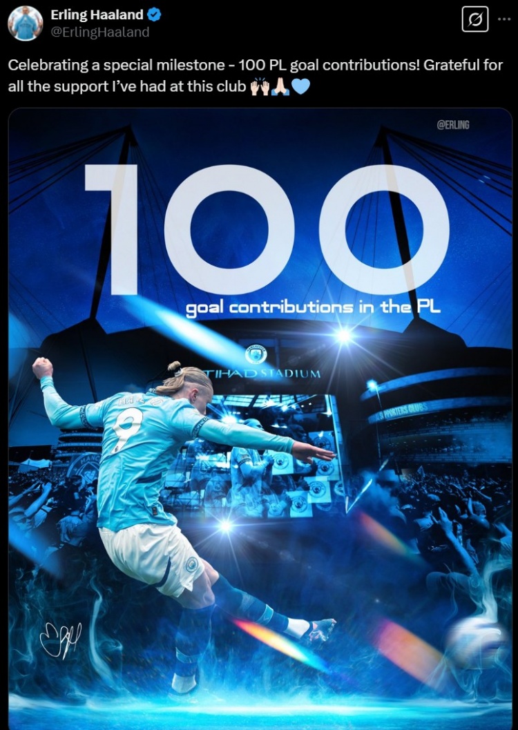 這是哈蘭德生涯在英超直接參與的第100粒進球(84球16助攻),他在個人社媒也曬出紀念海報,配文寫道:“紀念達成了一項特殊的里程碑—第100次參與英超進球。感謝我來到球隊以來一直支持我的人們?!?/p>