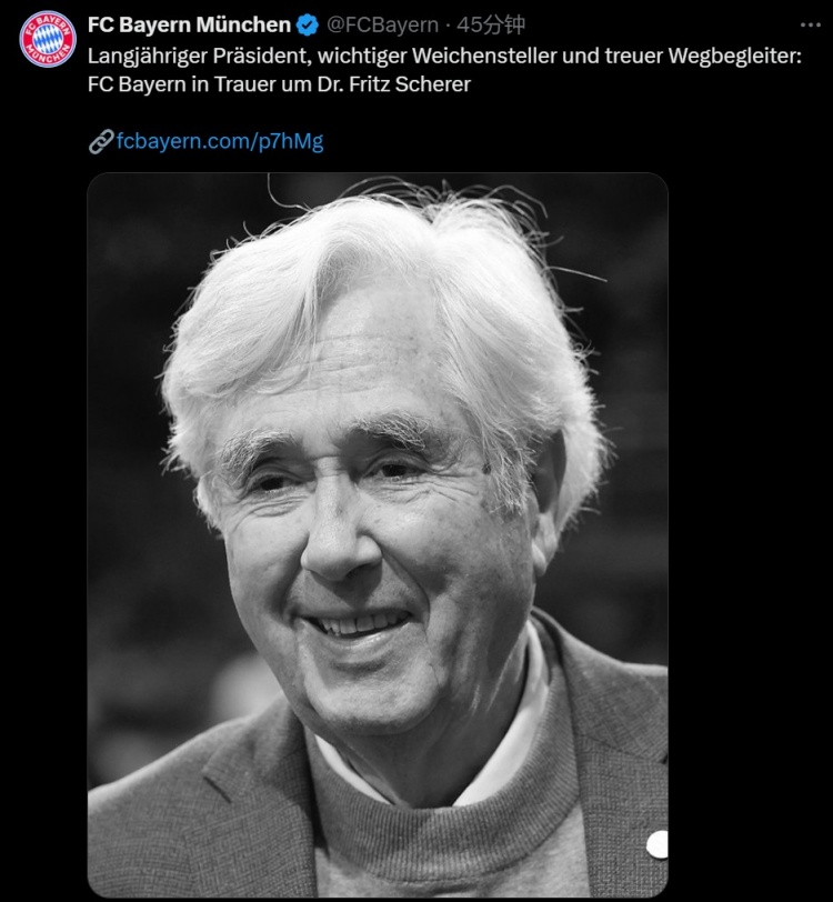3月16日訊 拜仁俱樂部官方發(fā)布通告,前高層弗里茨-舍勒去世,享年85歲。