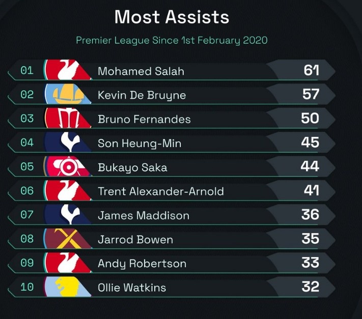 自B費(fèi)首秀以來英超助攻榜:B費(fèi)50次第三,僅次于薩拉赫&德布勞內(nèi)