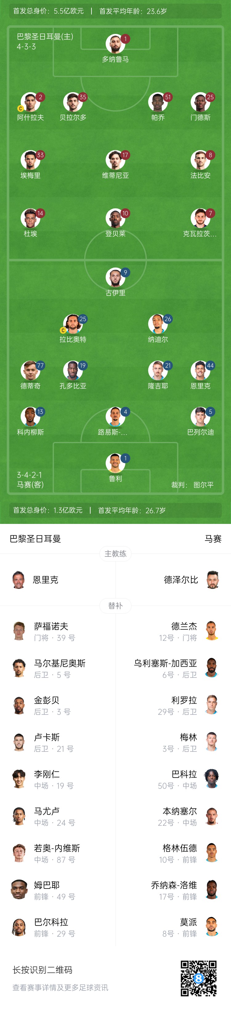 巴黎替補(bǔ):39-薩福諾夫、3-金彭貝、5-馬爾基尼奧斯、21-盧卡斯-埃爾南德斯、19-李剛?cè)省?4-馬尤盧、87-若昂-內(nèi)維斯、29-巴爾科拉、49-姆巴耶