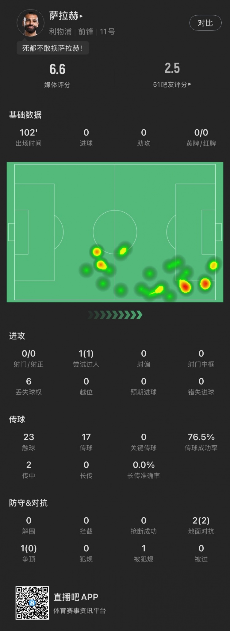 疑似上場!薩拉赫本場:0射門,傳球成功率76.5%,1過人,獲6.6分