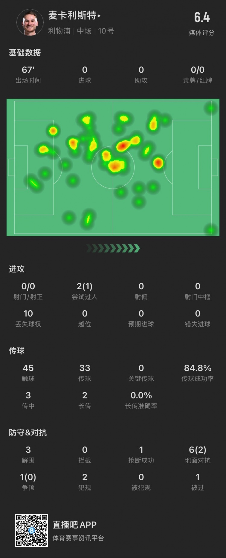 麥卡本場:7次對抗成功2次,貢獻3解圍1搶斷,2犯規(guī),僅獲評6.4分