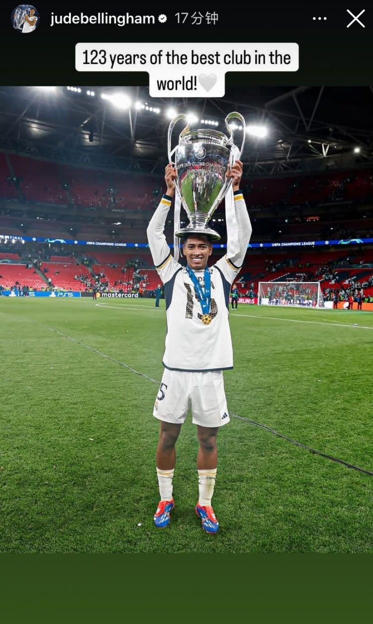 貝林厄姆曬出自己高舉歐冠獎(jiǎng)杯的照片,并寫道:世界上最好的俱樂部123歲了!