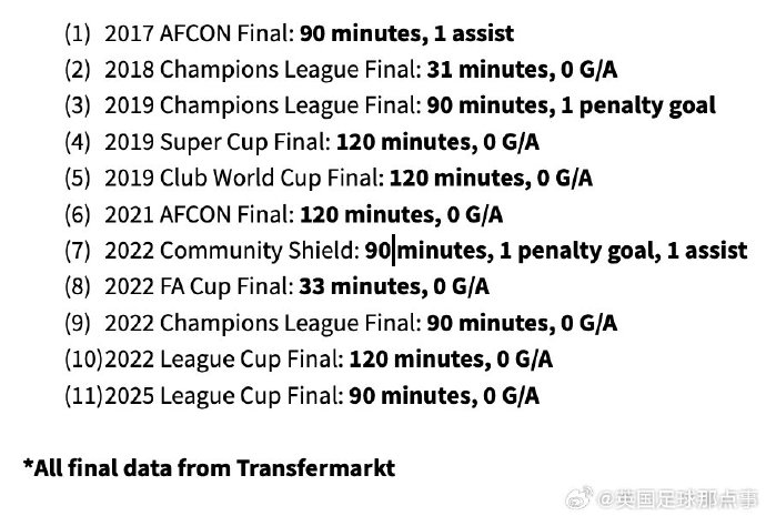 Transfermarkt:薩拉赫至今已代表俱樂(lè)部和國(guó)家隊(duì)參加了11場(chǎng)決賽,累計(jì)出場(chǎng)約1000分鐘,但從未打入非點(diǎn)球進(jìn)球。