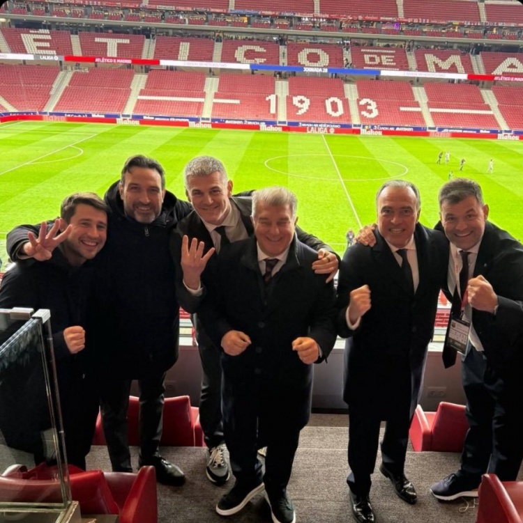 包括主席拉波爾塔在內(nèi)的一眾高層賽后在現(xiàn)場合影留念慶祝,多人手中還比出了“4”的手勢。