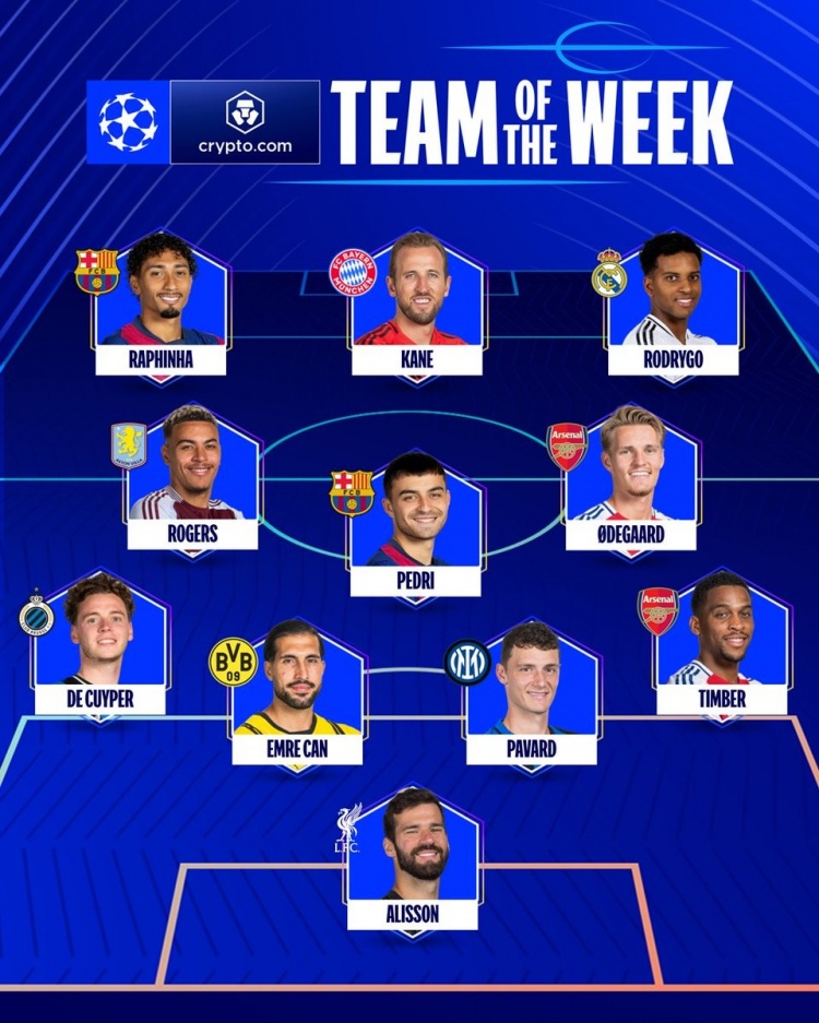 本輪歐冠官方最佳陣:阿利森&厄德高領銜,凱恩&羅德里戈在列