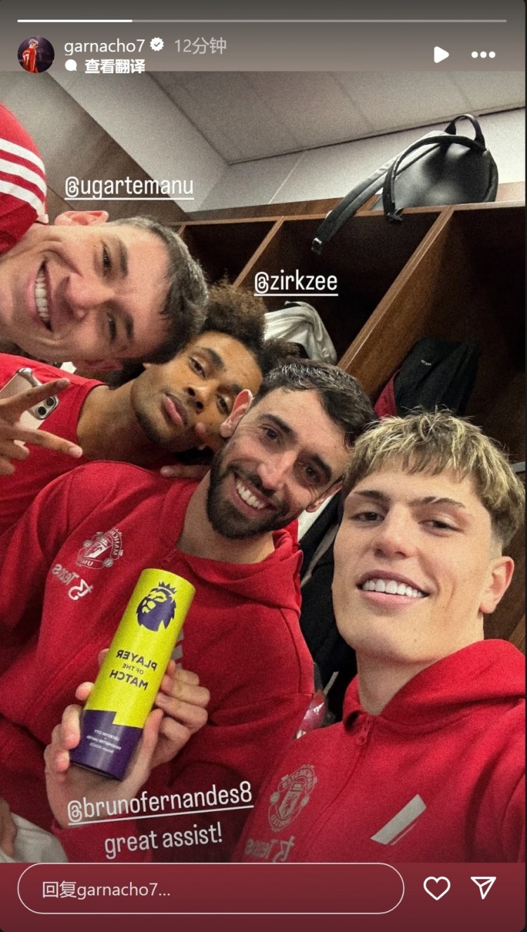 加納喬在社交媒體上曬出與B費、齊爾克澤、烏加特賽后的更衣室合照,他手拿B費的全場最佳獎杯,配文:“很棒的助攻?!?/p>