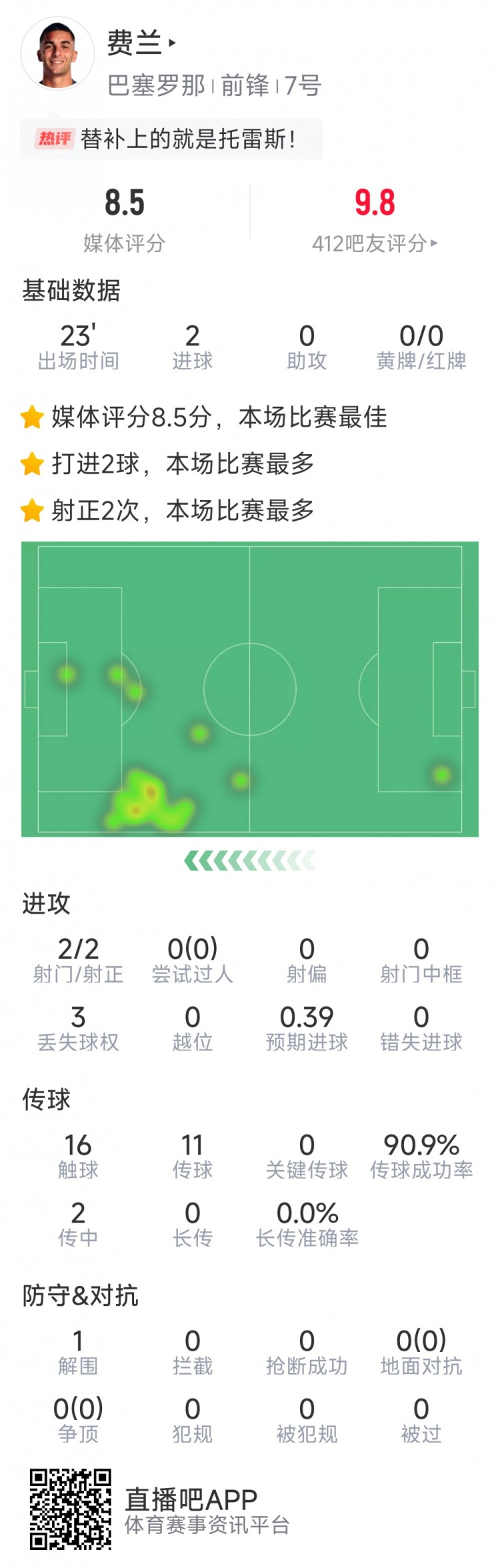 今天是托雷斯!費蘭本場數(shù)據(jù):登場23分鐘梅開二度,僅用2次射門