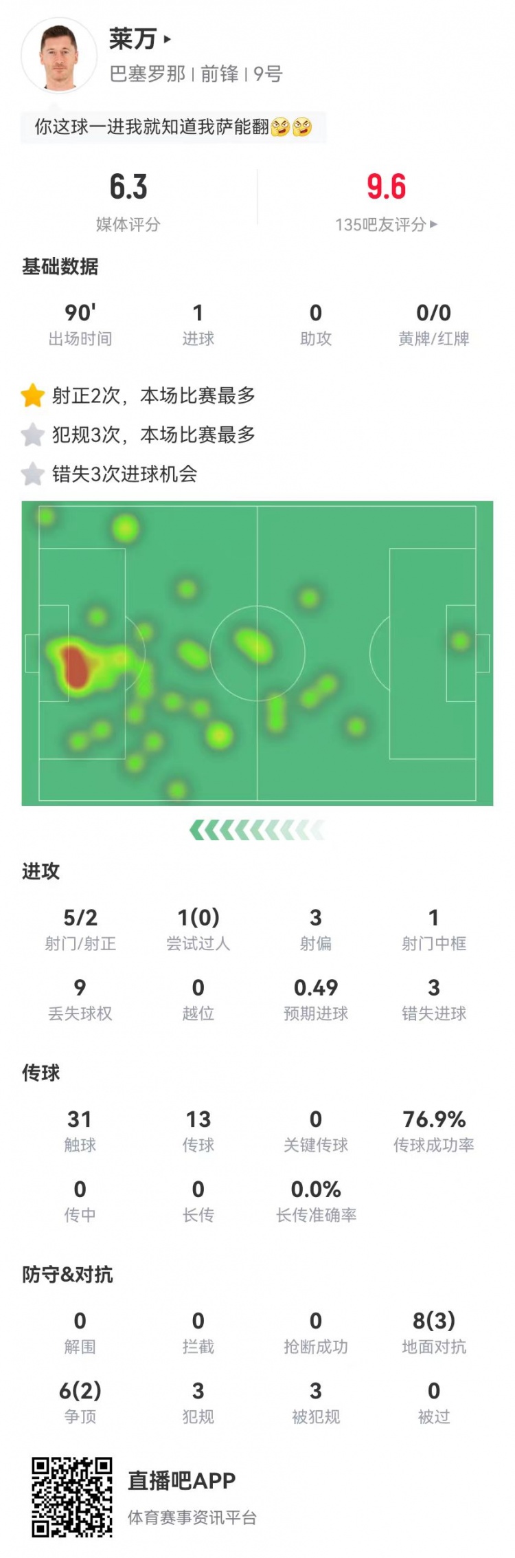 萊萬本場(chǎng)5射2正 1球3失良機(jī) 14對(duì)抗5成功 3犯規(guī)3造犯規(guī) 僅獲6.3分