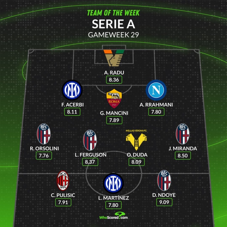 3月17日訊 WhoScored根據(jù)球員的評(píng)分列出了意甲第29輪最佳陣容,勞塔羅、阿切爾比、普利西奇在列,博洛尼亞4名球員入選。