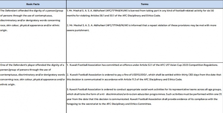 亞足聯(lián)確認(rèn)米沙勒在比賽中使用了種族歧視的行為及詆毀性言辭,侵犯了對(duì)方的尊嚴(yán),因此對(duì)其做出了停賽6個(gè)月的處罰。若其再次違反相關(guān)規(guī)定,可能會(huì)受到更嚴(yán)厲的處罰。
