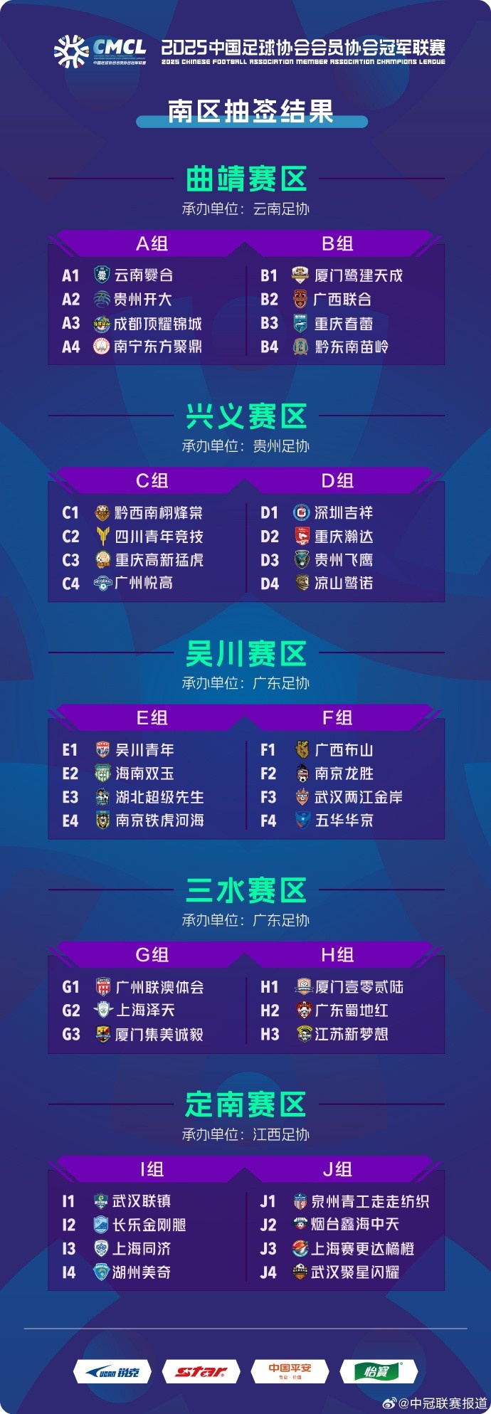 3月17日訊 2025賽季中冠聯(lián)賽南區(qū)抽簽結(jié)果出爐,本賽季中冠南區(qū)分5個賽區(qū)進行,每個賽區(qū)分2組,共計38支球隊參賽。