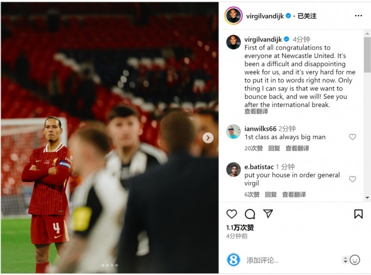 利物浦隊長范迪克社媒曬出自己賽后失落的照片,并寫道:“首先祝賀紐卡的每個人。對我們來說,這是艱難而令人失望的一周,現(xiàn)在我很難用言語來表達感受。我唯一能說的是,我們希望重新振作,我們會的!國際比賽日后再見?!?/p>