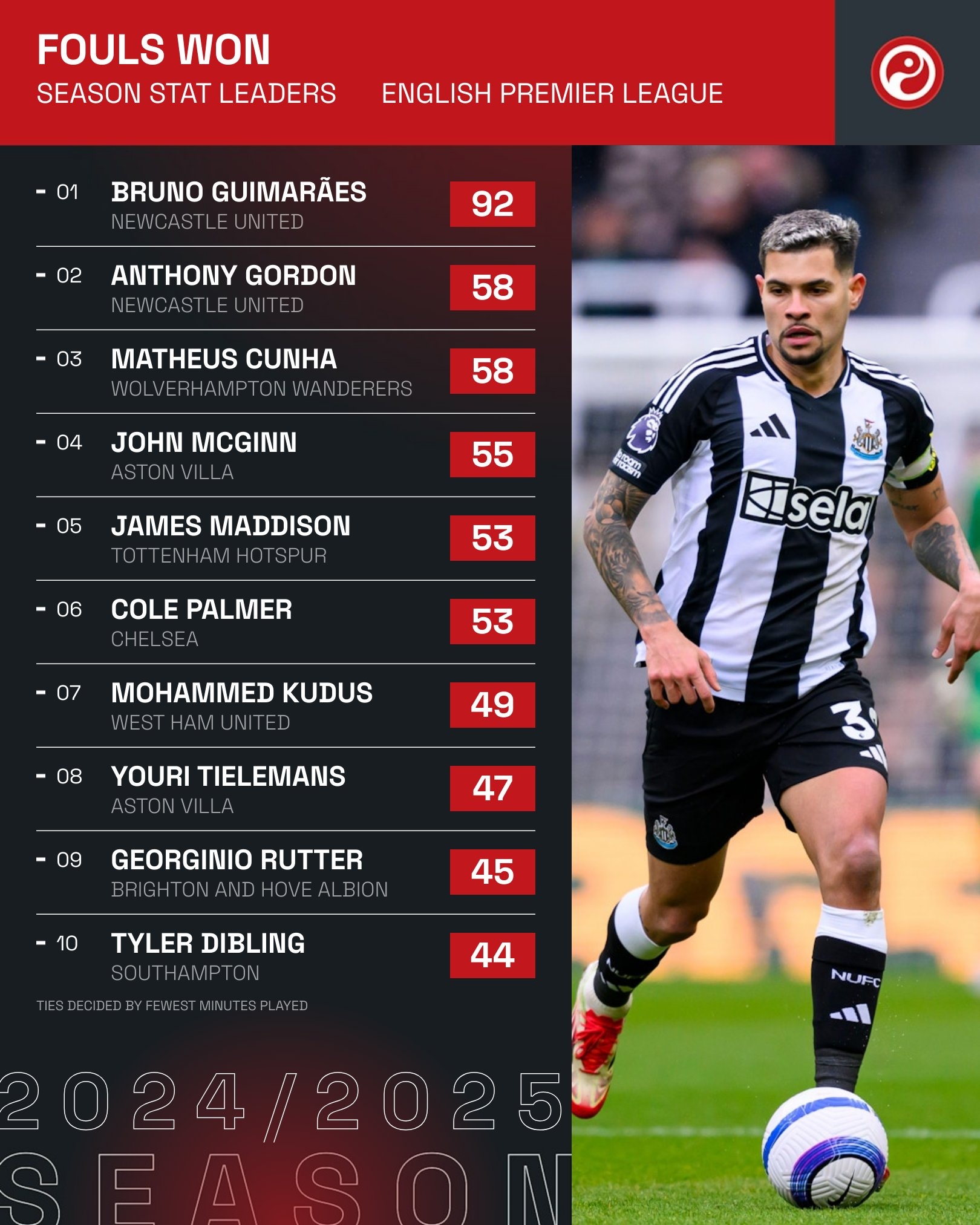 本賽季英超球員被犯規(guī)次數(shù)榜:吉馬良斯居首,麥迪遜、帕爾默在列