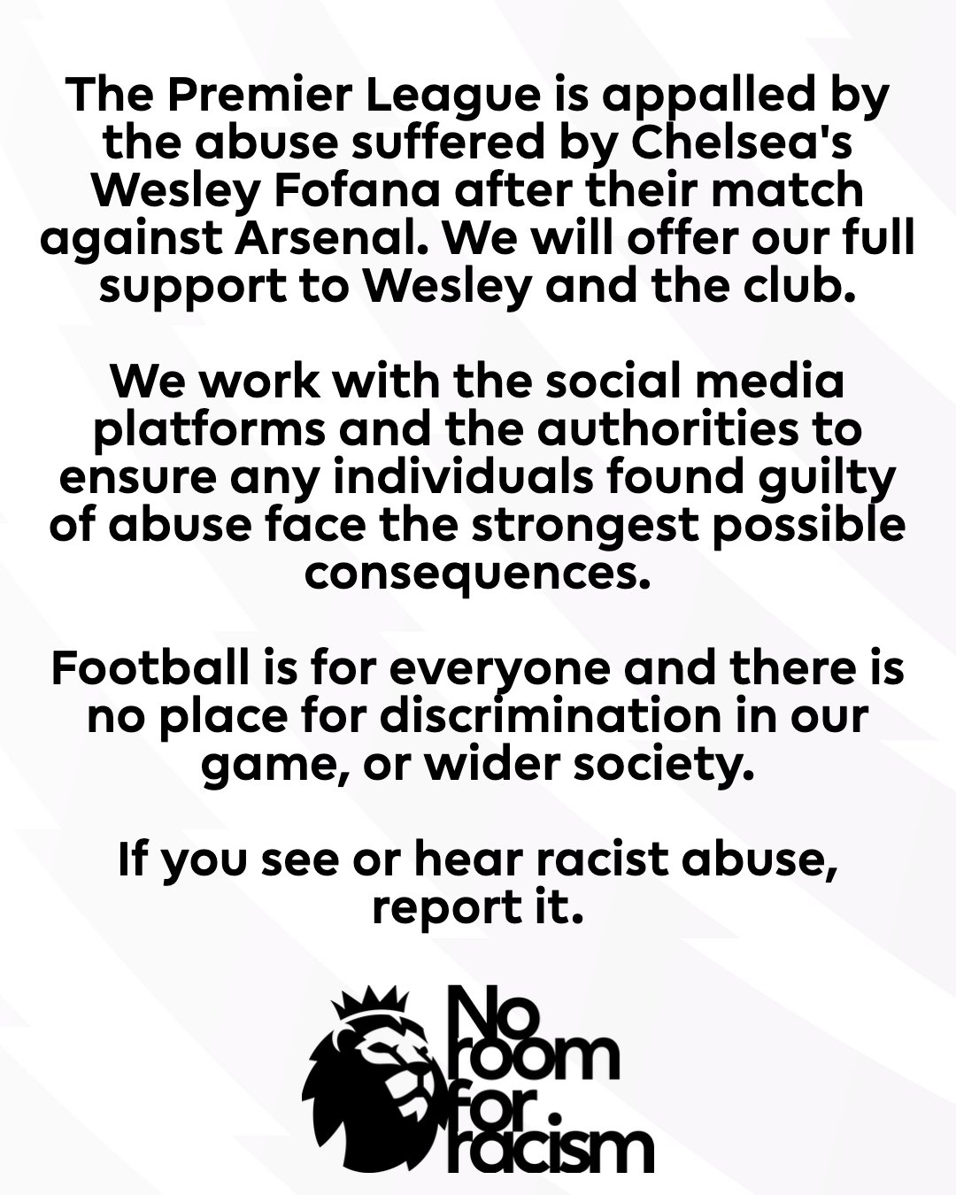 英超官方寫道:在切爾西對陣阿森納的比賽后,福法納遭到了辱罵,英超聯(lián)賽對此深感震驚。我們將全力支持福法納及切爾西俱樂部。