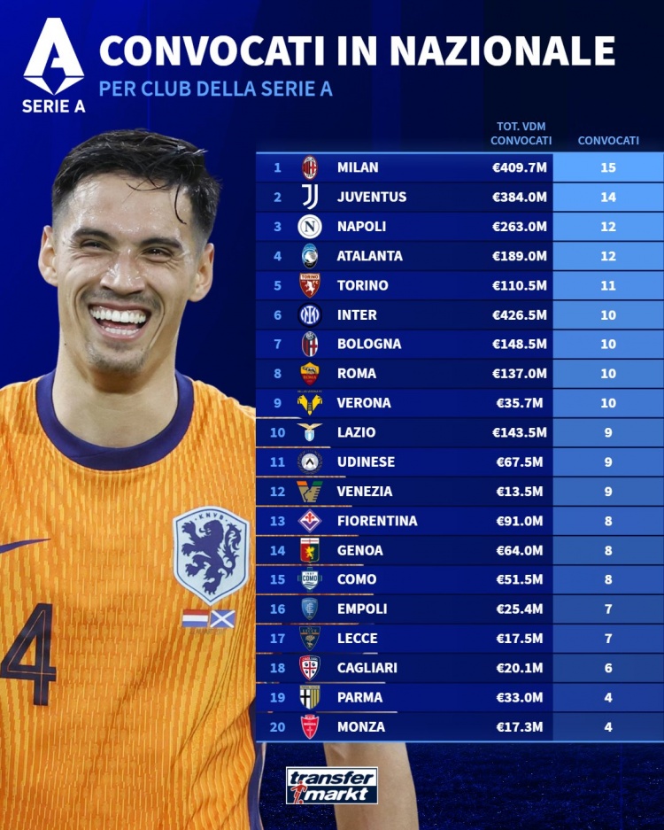 意甲國家隊征召人數(shù):米蘭15人最多,尤文14人次席&國米10人